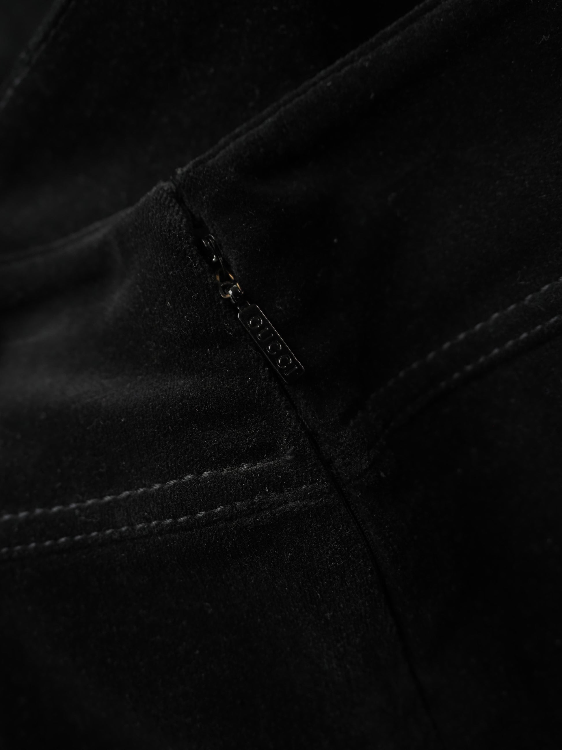Pils frá vetrarlínu Gucci 2002 eftir Tom Ford, úr velúr og uppbundið á hliðinni.